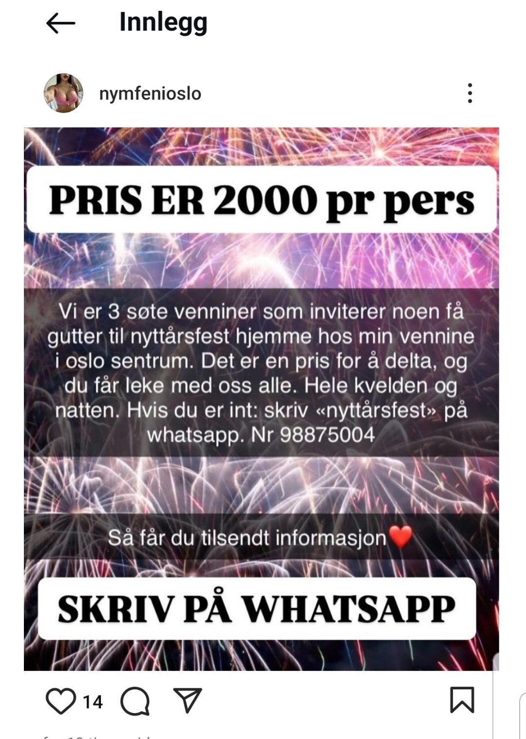 Jensjensenfranorge Skrevet Desember 27, 2024 Share Skrevet Desember 27, 2024 Dette er åpenbart scam, tlf nr kan søkes opp, og det er ikke til damer Siter Lenke til kommentar https://www.noresk.com/forum/emne/13601-nymfenioslo/#findComment-88239