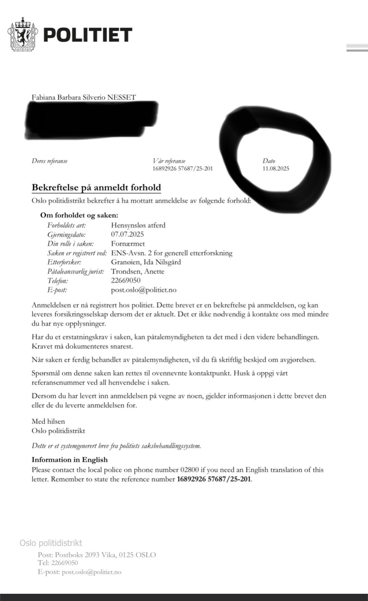 TitsMann Skrevet August 11 Forfatter Share Skrevet August 11 (endret) Goood morgen!!!! Fikk den mydelig brev i dag. Code ENS – Avsn. 2 – generell etterforskning, det betyr at politiet har tildelt saken til Enhet Sentrum, Avsnitt 2, og den går inn i aktiv etterforskning (ikke bare registrering eller henleggelse). så @Otono, @Politimestern @Mummyboyz @Oslo_bukken @Mikhen..Det er din tur !Spesiel for Og jeg trenger ikke lege mer bevis 😊 Lykke til med avhør ! ❤️ Endret August 11 av TitsMann Siter Lenke til kommentar https://www.noresk.com/forum/emne/16036-norsk-dinathe-real-one/?page=3#findComment-105494