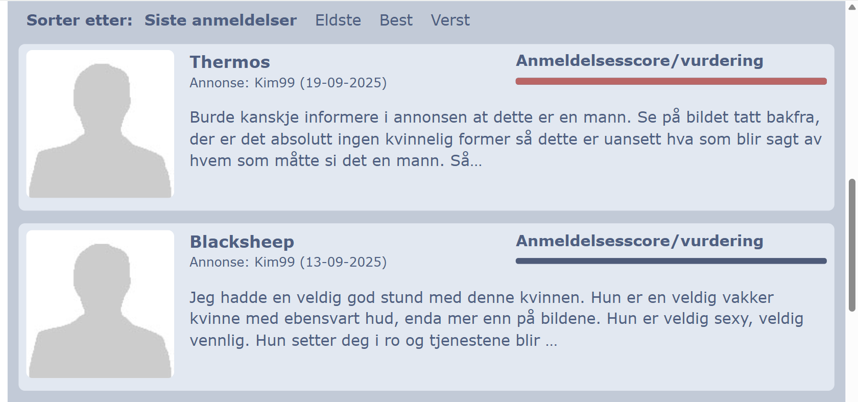 Thermos Skrevet Oktober 1 Share Skrevet Oktober 1 På 22.9.2025 den 0.27, Tukleren skrev: Vi vet ikke, vi går kun på at hen ikke ser spesielt feminin ut. Hvis Thermos svarer får vi kanskje vite mer... Det er antagelser tatt ut fra bildene, og da spesielt ett av de som fikk meg til å reagere. Det er lett å se på formene, og da særlig hoftene at dette er en ombygd mann (bilde tatt stående bakfra). Dette er noe jeg har lagt merke til i mine søk på RE, og jeg synes det burde vært gjort mer for å få disse til å stå frem med merking av at de er TS i annonsen. Jeg vet mange her liker slike, men det burde være unødvendig å sitte og gjette hva du besøker hvis du ikke ønsker en opplevelse som dette. RE fjernet anmeldelsen fordi de mente at den burde vært gjort utifra et besøk, men da er det i mine øyne bortkastet tid for jeg må i beste fall "snu i døra" som dere sier. 1 Siter Lenke til kommentar https://www.noresk.com/forum/emne/16485-skitne-horer/#findComment-109760
