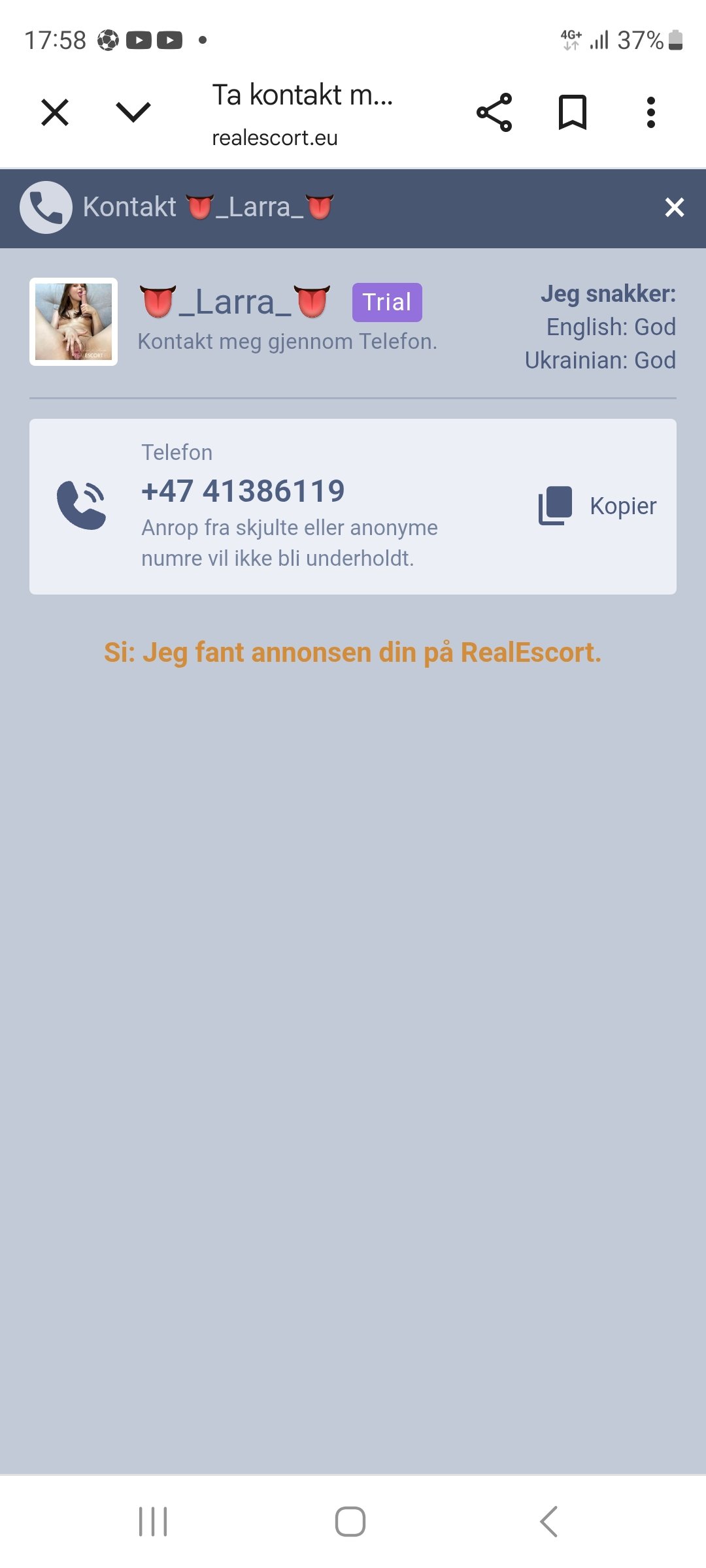 Larsens Skrevet Oktober 1 Share Skrevet Oktober 1 LARRA https://www.realescort.eu/ads/194132/larra En som gikk på limpinnen her. 4 Siter Lenke til kommentar https://www.noresk.com/forum/emne/16613-advarsler/