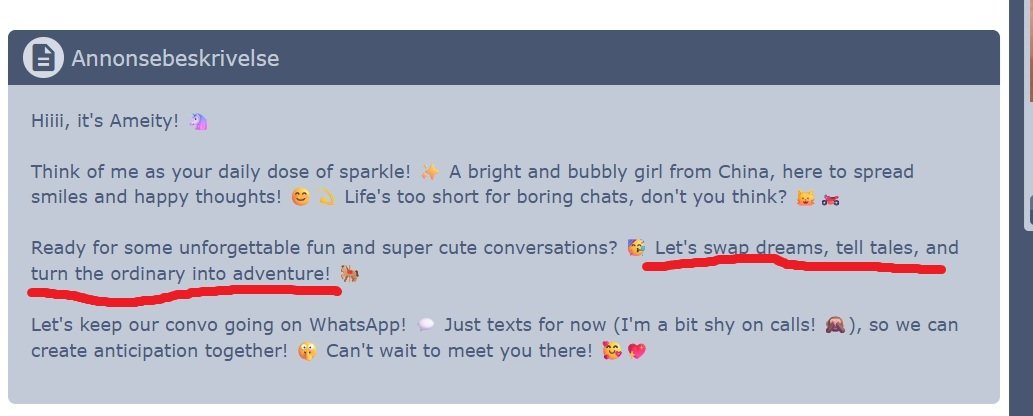 Natt Skrevet Januar 5 Forfatter Share Skrevet Januar 5 https://www.realescort.eu/ads/192629/ameity "Here to spread smiles..." ...mer som å spre beina. "Let's swap dreams, tell tales, and turn the ordinary into adventure..." Kanskje du får spille Dungeons & Dragons med henne. 2 Siter Lenke til kommentar https://www.noresk.com/forum/emne/17236-morsomme-beskrivelser-p%C3%A5-re/#findComment-117889