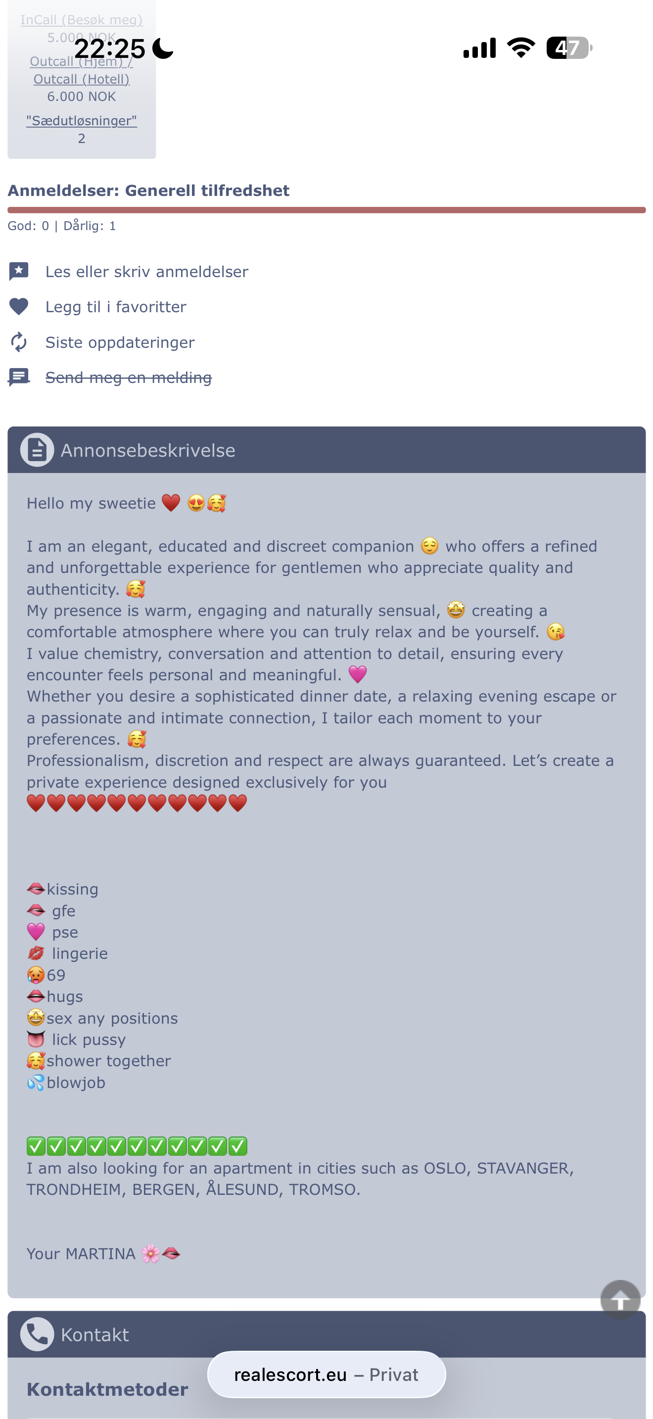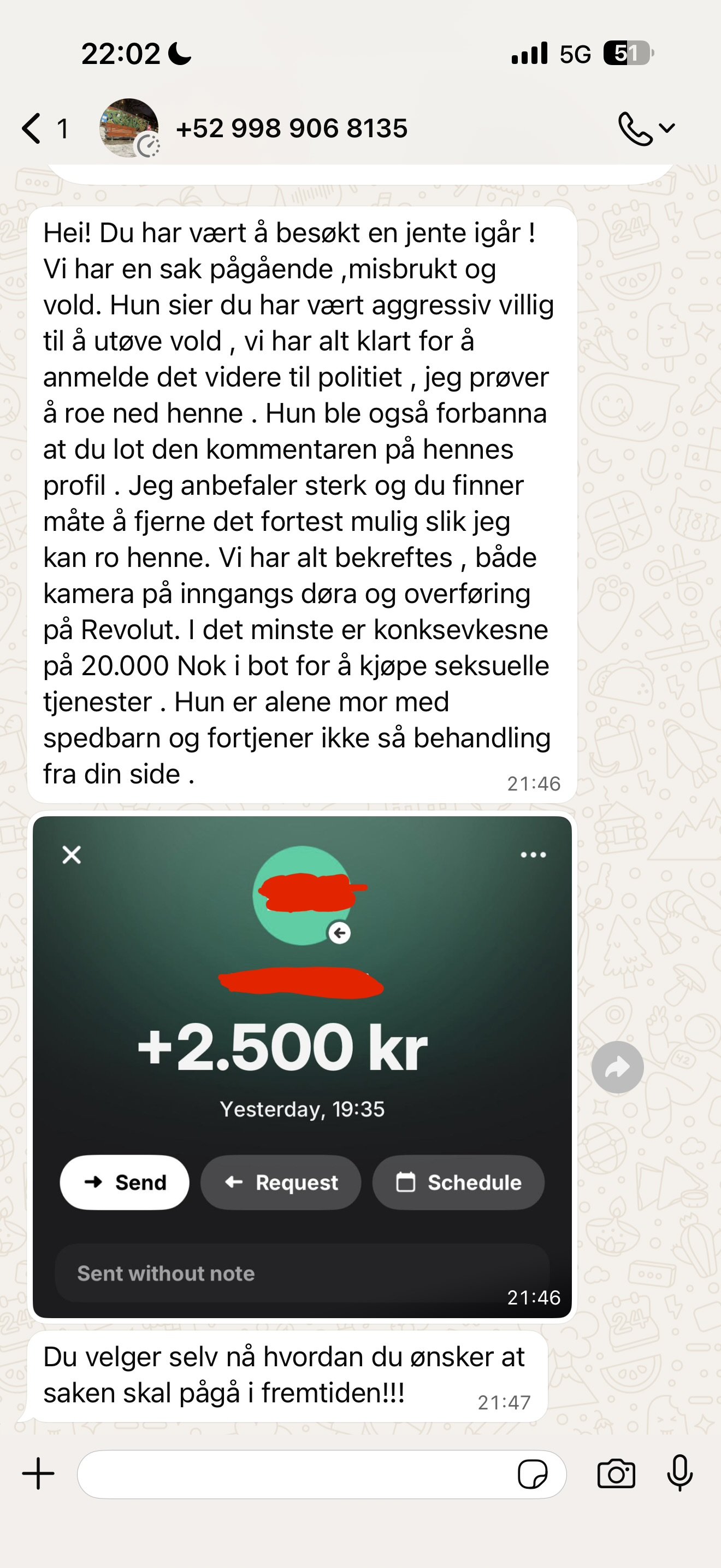 Svein01 Skrevet Februar 21 Share Skrevet Februar 21 Annonse: https://www.realescort.eu/ads/199935/martina-luxury Anmeldelse: «Et av de verste opplevelsene jeg har vært med på. Det starter med at hun spør deg på WA hva du liker og hvor lenge du ønsker å bli. Jeg svarer med at jeg liker GFE med french kissing, OWO og gode samtaler. Også svarer hun med at hun også liker det samme. Også gir hun meg en pris på 2500kr for timen. Jeg møter opp. Og jeg må si at hun ser virkelig pen ut. Veldig fin kropp og helt fantastisk utseende. Men der slutter det. Starter med at hun ber om 3000kr for timen. Når jeg viser til tidligere melding så endrer hun prisen tilbake til 2500kr. (Når du kontakter dama så er det egentlig agenten som svarer på meldingene). Før jeg betaler så spør jeg muntlig om hun liker french kissing and OWO, noe hun svarer ja til. Også betaler jeg 2500kr. Når jeg etterhvert spør om å french kisse, så sier hun at det ikke er noe hun tilbyr, selv om hun og agenten hadde bekreftet det flere ganger tidligere. Ender opp med at hun kysser smått og aggressivt. Ingen GFE whatsoever. Også etterhvert som vi skal videre på OWO, så sier hun at dette er også noe hun ikke tilbyr. Når jeg henviser til meldingene så beklager hun og unnskylder seg for miskommunikasjonen. Så det blir altså ingen OWO heller. Hun gir meg kondomet uåpnet og vil til og med at jeg selv tar den på. Etter det så suger hun og etter det så drar jeg på bade for å rense meg. Når jeg var ferdig ber jeg henne om håndkle og hun gir meg et som ser brukt ut og som har noen gule flekker på seg. Den så altså ikke noe særlig rent ut. Også går jeg tilbake til rommet, og etterhvert spør om sex. Da sier hun at tida holder på å utløpe. Jeg svarer nei, jeg betalte da og da som vil si at jeg har så så mye tid igjen. Også reiser hun seg opp og begynner å texte med agenten. Og det vaaaarte så lenge. Hun brukte 15min på å tekste uten å overdrive det. Også sier hun at jeg betalte for 45 min. Også sier jeg igjen at jeg har betalt for 1 time, 2500kr og henviser til meldingen. Også chatter hun med agenten igjen og mener at jeg har 5 min igjen. Og da gjentar jeg at hun har brukt 15min på å snakke med agenten og at jeg har så så mye tid igjen fra da jeg betalte. Etter det legger hun fra seg mobilen, gir meg kondomet som hun forventer at jeg tar på selv, igjen, mens den fortsatt er liten og ikke blitt hard ennå. Jeg gjør som hun vil, settern på, også bare stirrer hun på den uten å «vite» hva hun skal gjøre. Skylder på meg at jeg ikke er hard. Jeg ber henne ta på den først for å gjøre den hard. Hun tar i det uten noe følelse. Og på det tidspunktet så hadde jeg mistet lysten totalt. Jeg sa at jeg ikke orket noe mer og tok meg en dusj og dro. Dette var et av de verste opplevelsene jeg har hatt noen sinne og anbefaler ingen å oppsøke henne. Finnes mange andre gode alternativer der ute. Hun snakker heller ikke et eneste ord med engelsk og alt foregikk over google oversetter. Hun brukte også utrolig mye mobil og chatta med agenten hele tiden. Jeg fraråder henne på det sterkeste pga. den svært dårlige servicen du får for de penga du betaler.» Jeg mottok en melding på whatsapp 1 dag etter denne anmeldelsen. Der stod det følgende: «Hei! Du har vært å besøkt en jente igår ! Vi har en sak pågående ,misbrukt og vold. Hun sier du har vært aggressiv villig til å utøve vold , vi har alt klart for å anmelde det videre til politiet , jeg prøver å roe ned henne . Hun ble også forbanna at du lot den kommentaren på hennes profil . Jeg anbefaler sterk og du finner måte å fjerne det fortest mulig slik jeg kan ro henne. Vi har alt bekreftes , både kamera på inngangs døra og overføring på Revolut. I det minste er konksevkesne på 20.000 Nok i bot for å kjøpe seksuelle tjenester . Hun er alene mor med spedbarn og fortjener ikke så behandling fra din side.» Nå vet jeg ikke hvor seriøs hun er i den trusselen, men jeg antar at det bare er en melding for å skremme meg. Har noen andre vært borti det før og som evt. har noen råd til hvordan tre videre? Jeg slettet meldingene mine som jeg sendte på whatsapp etter besøket. Jeg betalte 2500kr gjennom Revolut 2 2 7 Siter Lenke til kommentar https://www.noresk.com/forum/emne/17798-trussel-fra-en-escorte-som-jeg-la-en-d%C3%A5rlig-anmeldelse-p%C3%A5/