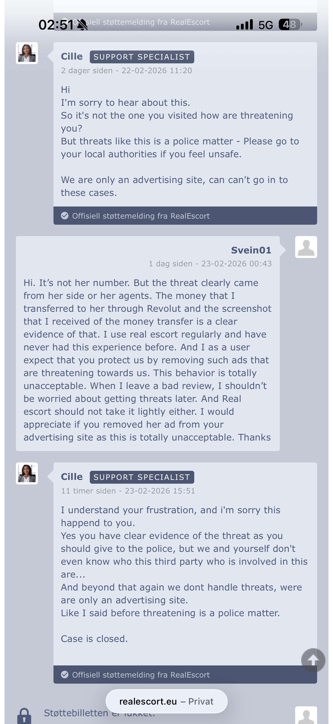 Pelle Parafin Skrevet Februar 24 Share Skrevet Februar 24 5 timer siden, Svein01 skrev: Takk for alle gode tips og råd🙏. Jeg skal definitivt ta meg med det videre. Jeg har i ettertid tatt kontakt med RealEscort til kundeservice også, i håp om at de skulle fjerne annonsen, uten hell. Jeg legger til screenshot av samtalen vår. Det virker som de er ganske ubrukelige når sånne ting skjer, bare så dere vet det dere også. Ja, slik må de nok svare og stå hardt på. At de kun er et annonseforum. Hvis ikke hadde de blitt tatt ned og tatt for formidling av seksuelle tjenester etter kort tid, og det er jo straffbart. 1 Siter Lenke til kommentar https://www.noresk.com/forum/emne/17798-trussel-fra-en-escorte-som-jeg-la-en-d%C3%A5rlig-anmeldelse-p%C3%A5/#findComment-119652