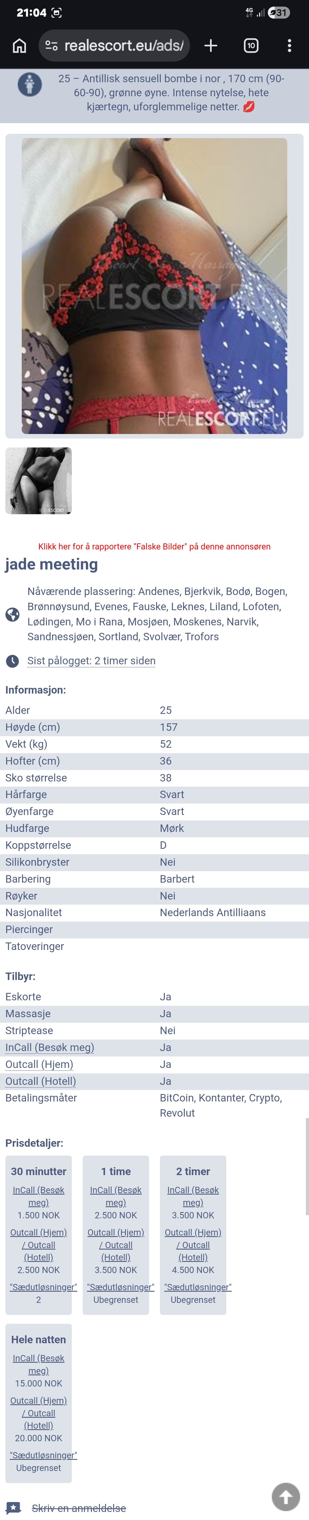 Skrevet Søndag klokken 20:181 dg Nå er denne eskorten "tilbake" i nord. For en måned siden kontaktet jeg annonsøren og det viste seg fort at dette var lureri. Betal med paysafe sa hun. Da jeg viste et bilde av kvitteringen forlangte hun å få se QR-koden før hun slapp meg inn. "Du lurer ikke en luring" tenkte jeg og konfronterte henne. Utdrag av samtalen kan du se på bildene. Ikke bruk energi på det engang