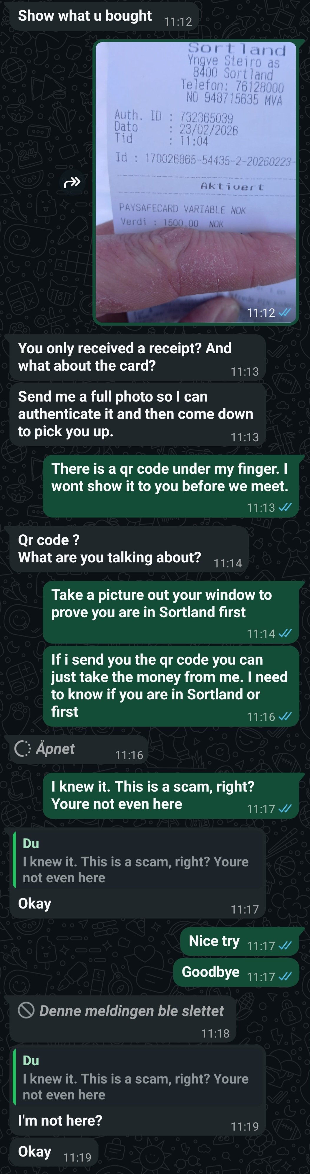 Skrevet Søndag klokken 21:421 dg Jeg ante ugler i mosen, men spanderte noen meldinger på WA. "Hun" er mange plasser og spør hvor du er nøyaktig, og da får du en konkret adresse på stedet ditt. Jeg sa jeg bruker bare cash, hvorpå jeg fikk følgende svar; "Take ur cash and go buy the paysafecard at Coop obs SPAR EXTRA, joker kiosk when u are coming to my appart. You give me the card and we can have sex normally as planned. Isn`t all?"Fransk WA-nummer.